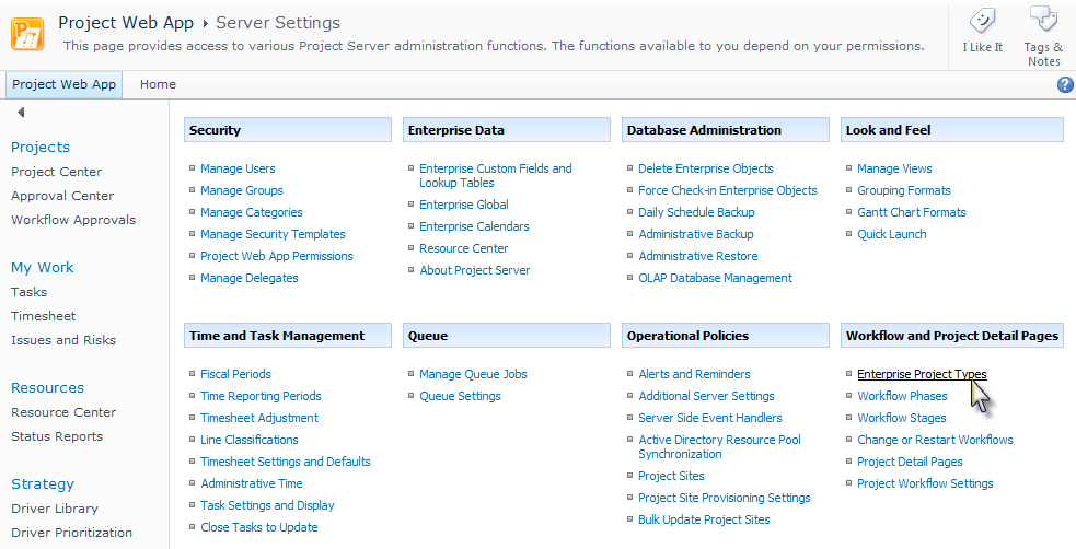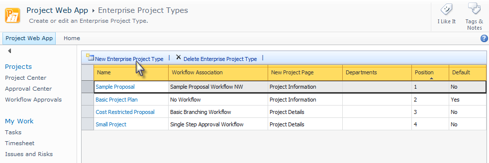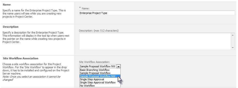 To associate a Project Server workflow to an Enterprise Project Type, refer to Associating a Project Server Workflow with an Enterprise Project Type for more information