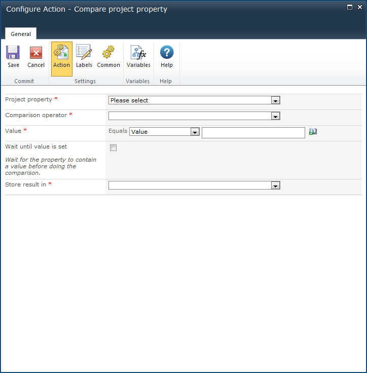 This workflow action can be used to compare a project property with a specified value. It will return true/false based on the comparison outcome.