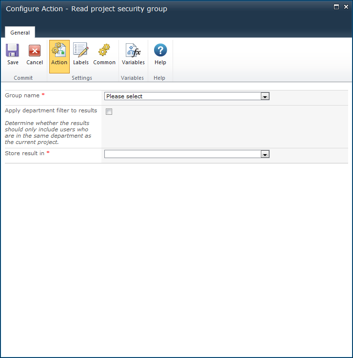 Select the workflow variable to store the users retrieved from the specified project server security group. To create a variable, click the Variables button.