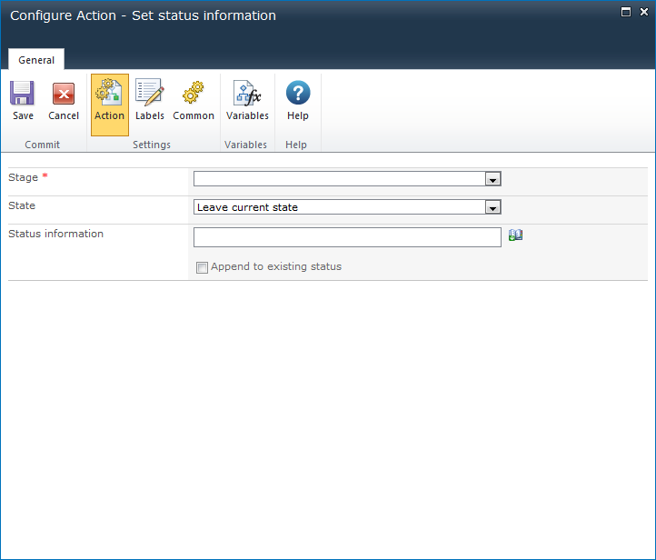 Select the Append to existing status option to add to the existing state information. The Status Information is also updated automatically by the Set project stage action. If this option is not selected the Status Information added by the Set project stage action will be overwritten.