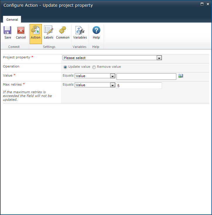 The maximum number of times that the workflow action will try to update the project property. If the maximum retries is exceeded, the field will not be updated.